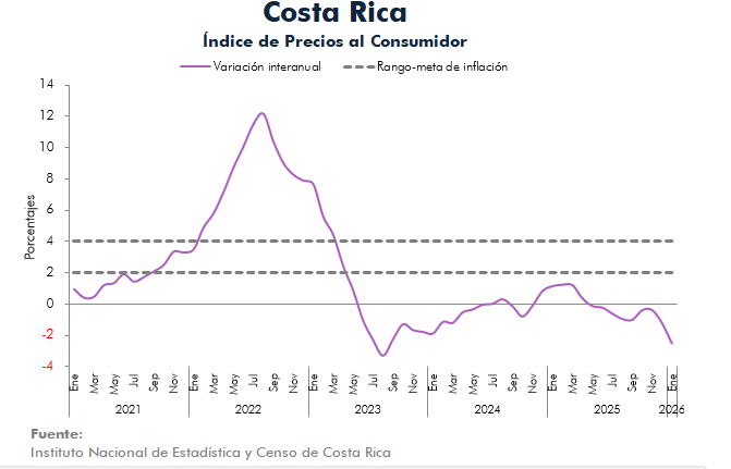 El Instituto Nacional de Estadística y Censos informa que el índice de precios al consumidor (IPC) del Costa Rica mostró una variación interanual de -2.53 % en enero de 2026, y reportó una variación mensual de -0.96 %, siendo la mayor disminución mensual desde 1983.