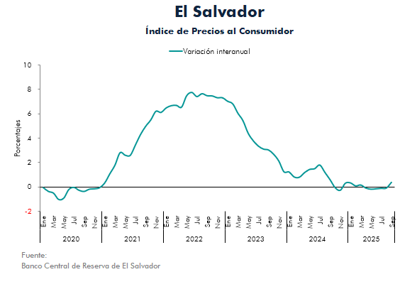 El Banco Central de Reserva de El Salvador (BCR) informa que la inflación interanual para septiembre de 2025 se ubicó en 0.36 %, registrando una inflación positiva luego de cinco meses de caída de precios, e inferior al 0.58 % observado doce meses antes. Por otra parte, la inflación mensual fue de 0.06 %.