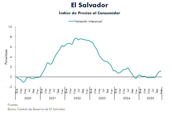 El Banco Central de Reserva de El Salvador (BCR) informa que la inflación interanual para noviembre de 2025 se ubicó en 1.14 %, superior al 0.30 % observado doce meses antes. Por otra parte, la inflación mensual fue de 0.11 %.