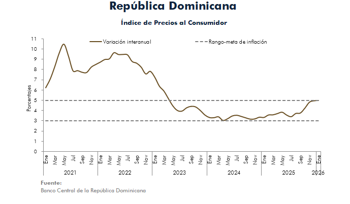 El Banco Central de la República Dominicana (BCRD) informa que el índice de precios al consumidor (IPC) registró una variación interanual medida desde enero de 2025 hasta enero de 2026 se ubicó en 4.98 %, permaneciendo dentro del rango meta establecido en el programa monetario para la inflación de 4.0 % ± 1.0 %. Por su parte, la inflación mensual durante enero de 2026 fue de 0.40 %.