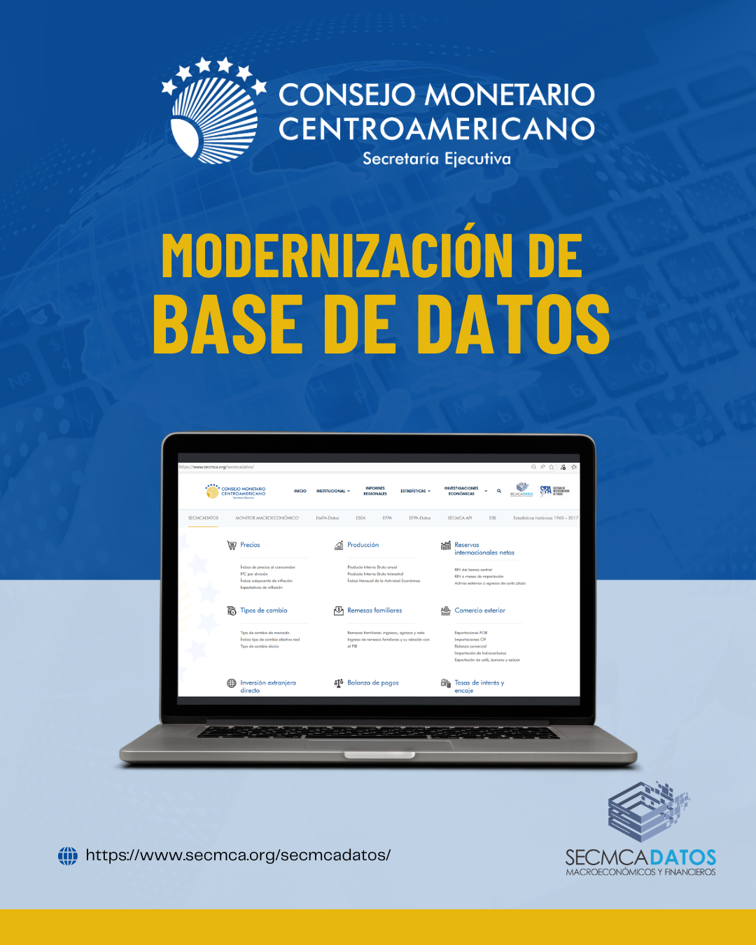 En el marco del convenio de cooperación técnica no reembolsable con el Banco Centroamericano de Integración Económica (BCIE), la Secretaría Ejecutiva del Consejo Monetario Centroamericano (SECMCA) modernizó su base de datos macroeconómicos, con el objetivo de continuar ofreciendo a distintos sectores una plataforma de fácil acceso con información estadística relevante.