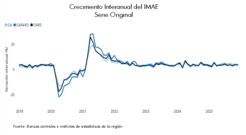 La actividad económica de la región de Centroamérica y República Dominicana (CARD), medida por el IMAE en su serie original, registró una variación acumulada de 3.53 %, al cierre de diciembre de 2025. Esta cifra representa una desaceleración de 0.17 puntos porcentuales, respecto a la tasa de crecimiento de diciembre de 2024. A nivel de países, el crecimiento acumulado estuvo liderado por Nicaragua (4.83 %), Costa Rica (4.75 %), Guatemala (4.14 %) y Honduras (3.69 %). Mientras que, en El Salvador y República Dominicana, el crecimiento acumulado se ubicó en 3.47 % y 2.12 %, respectivamente.