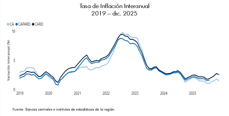 Los últimos datos referentes al IPC de la región de Centroamérica y República Dominicana (CARD) muestran que, en diciembre de 2025, la inflación interanual se ubicó en 2.60 %; incrementando en 0.36 puntos porcentuales, respecto a la tasa de inflación de diciembre de 2024. A nivel de países, en Costa Rica, se registró una variación interanual de -1.23 %, en El Salvador de 0.91 %, en Guatemala de 1.65 %, mientras, en Honduras la inflación interanual alcanzó la cifra de 4.98 %. En tanto, en Nicaragua y República Dominicana la inflación interanual fue de 2.70 % y 4.95 %, respectivamente.
