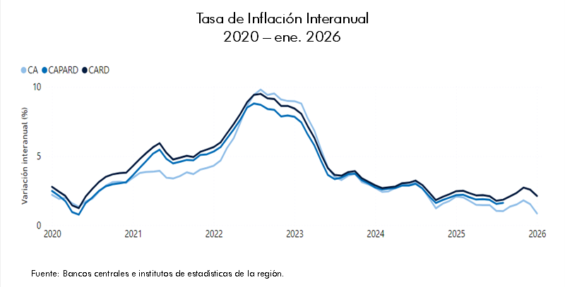 En enero de 2026, el índice de precios al consumidor (IPC) de la región de Centroamérica y República Dominicana (CARD) registró una variación interanual de 2.11 %; desacelerándose en 0.35 puntos porcentuales, respecto a la tasa de inflación de enero de 2025. A nivel de países, en Costa Rica, se registró una variación interanual de -2.53 %, en El Salvador de 0.65 %, en Guatemala de 0.96 %, mientras que, en Honduras la inflación interanual alcanzó la cifra de 4.23 %. En tanto, en Nicaragua y República Dominicana la inflación interanual fue de 3.03 % y 4.98 %, respectivamente.