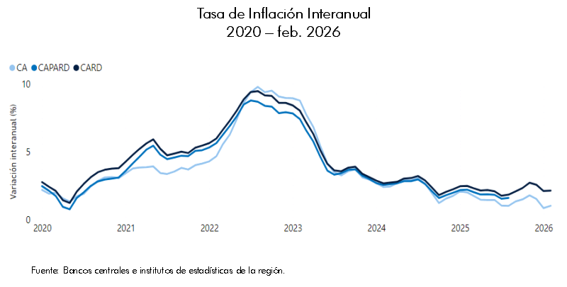 En febrero de 2026, el índice de precios al consumidor (IPC) de la región de Centroamérica y República Dominicana (CARD) registró una variación interanual de 2.14%; desacelerándose en 0.35 puntos porcentuales, respecto a la tasa de inflación de febrero de 2025. A nivel de países, en Costa Rica, se registró una variación interanual de -2.73%, en El Salvador de 1.17%, en Guatemala de 1.55%, mientras que, en Honduras la inflación interanual alcanzó la cifra de 3.46%. En tanto, en Nicaragua y República Dominicana la inflación interanual fue de 2.86% y 4.67%, respectivamente. Cabe mencionar que, en términos acumulados, la inflación se ubicó en 0.40% a nivel regional.