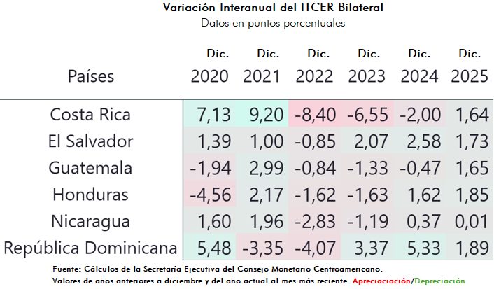 Al mes de diciembre de 2025, la variación interanual del ITCER bilateral con EUA reflejó depreciaciones reales en Costa Rica (1.64%), El Salvador (1.73%), Guatemala (1.65%), Honduras (1.85%), Nicaragua (0.01%) y República Dominicana (1.89%).